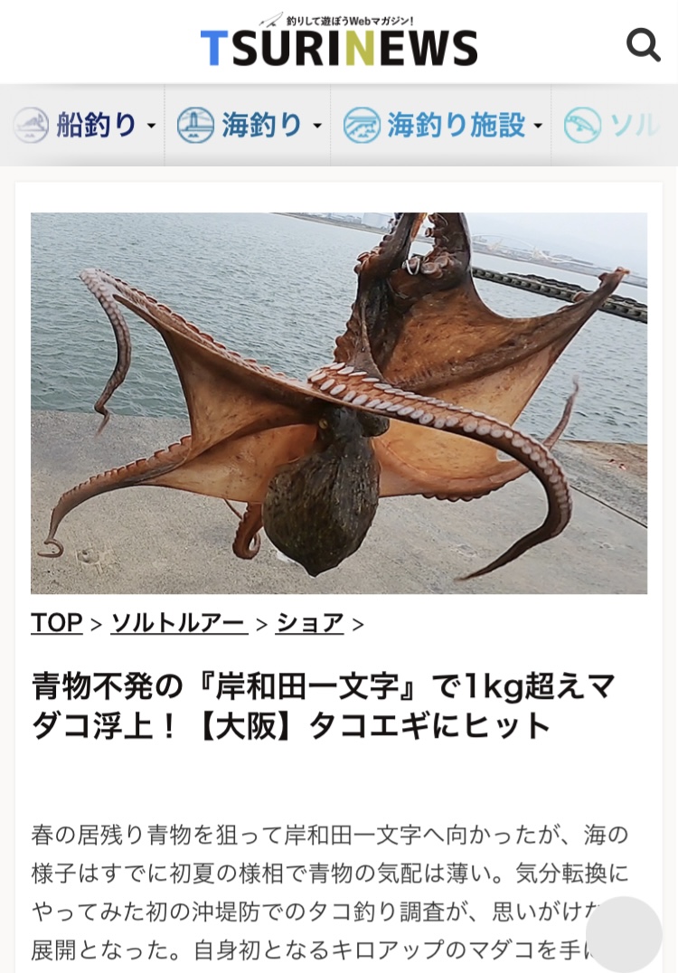 【執筆】「青物不発の『岸和田一文字』で1kg超えマダコ浮上!【大阪】タコエギにヒット」